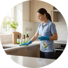 Full kitchen sanitisation including surfaces, appliances, cabinets, and tiles for a fresh space.